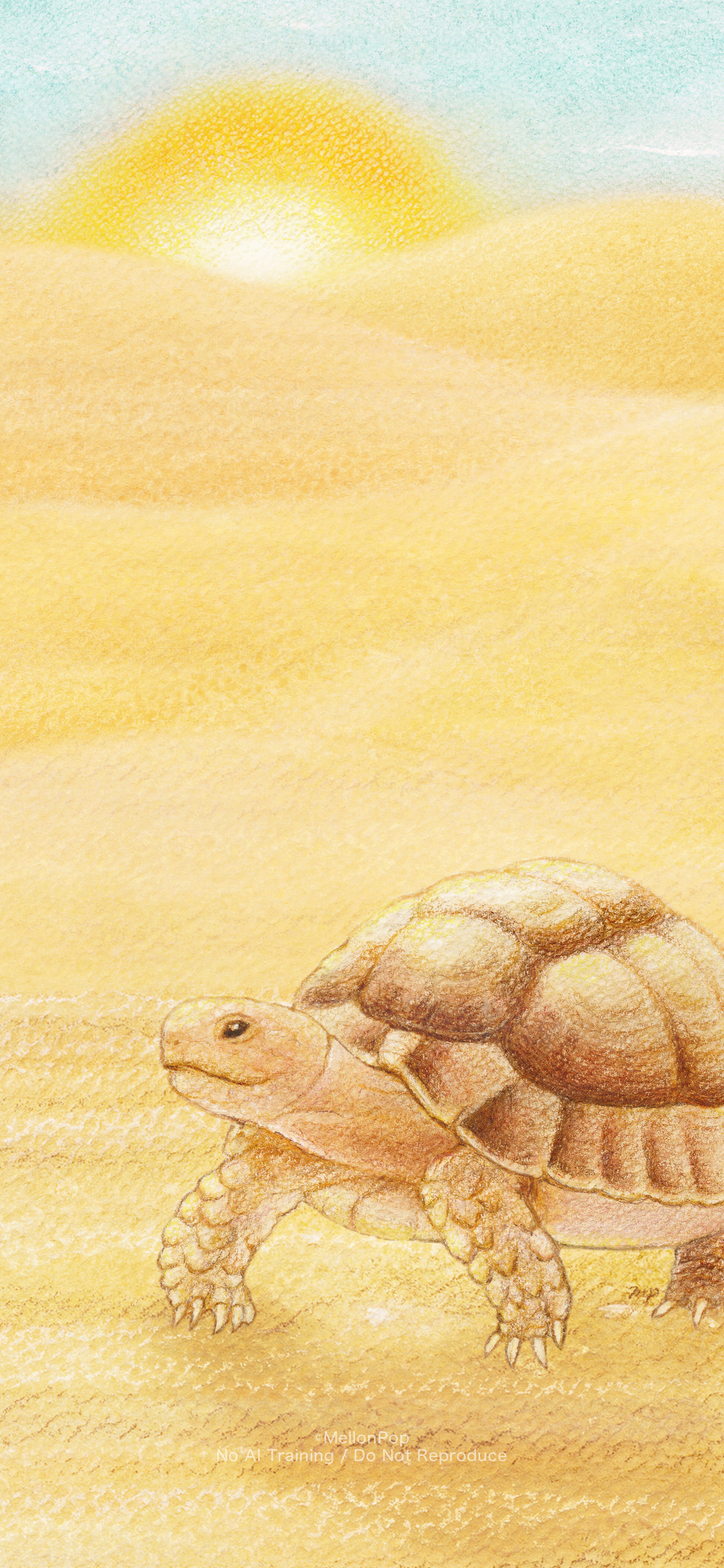 過酷な環境で生き抜く為に進化した小さな体。大きくなっても手のひらサイズの小さな命が、しっかりと砂漠の大地を踏みしめて、新しい一歩を踏み出す様子を描きました。
