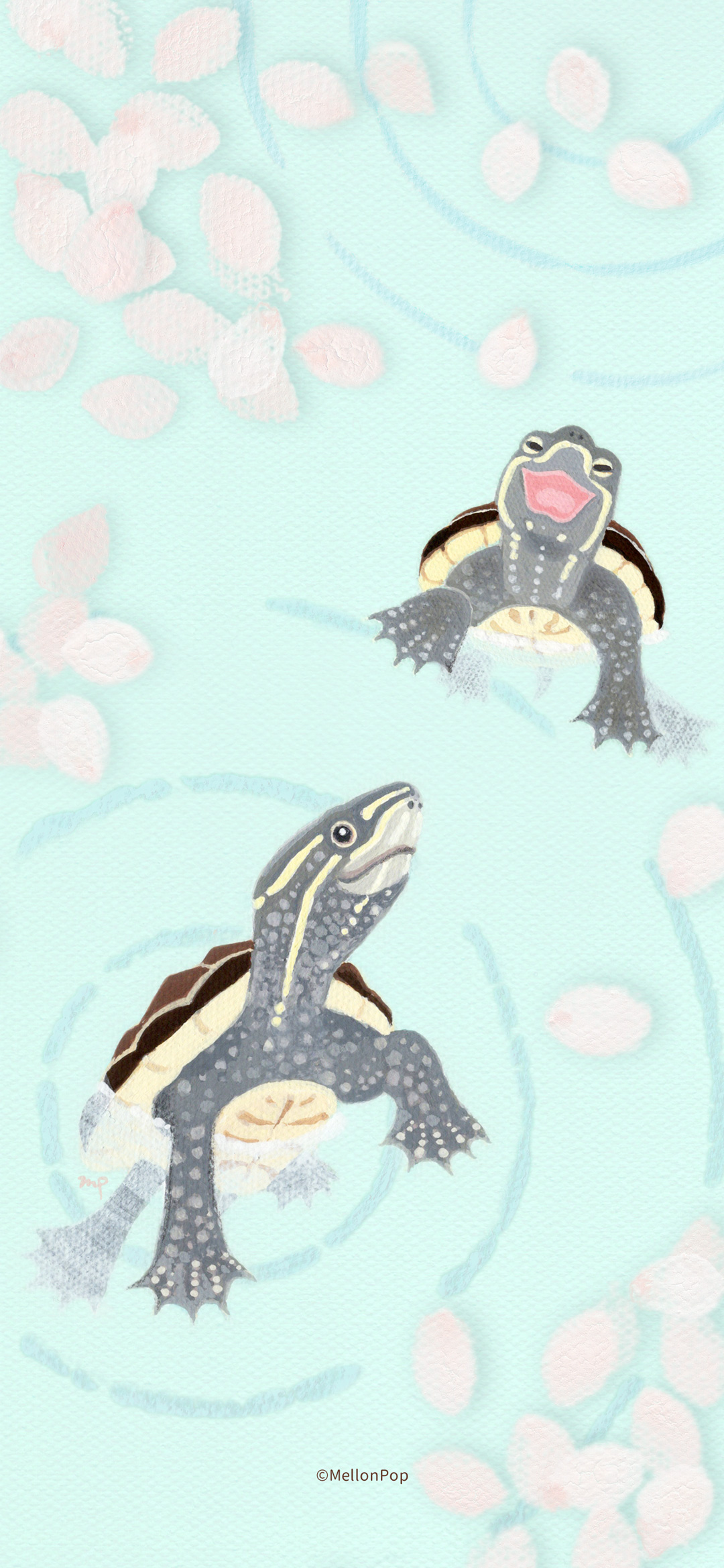水面を楽しそうに泳ぐ2匹のミシシッピニオイガメの子を描きました。