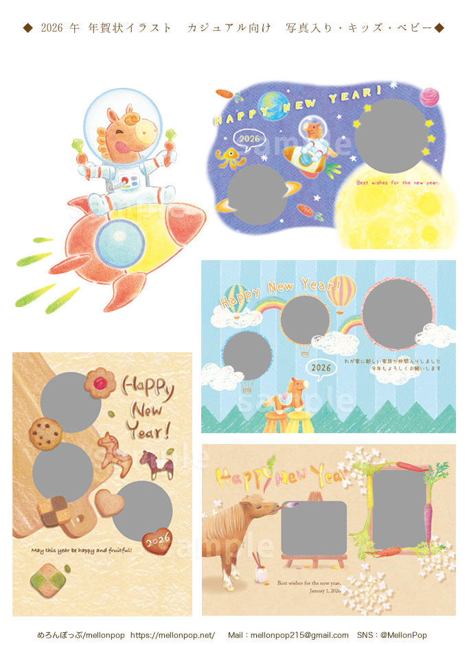 その他、転居・出産のご報告、寒中・暑中見舞いなど、色鉛筆やパステル、絵の具を用いたアナログの風合い豊かなイラストをご提案いたします。